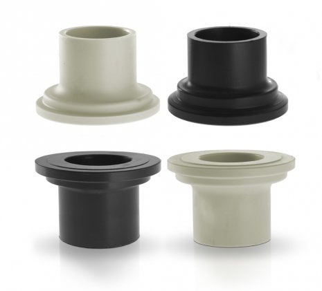 Die Einlegeteile sind gedreht und außen abgestuft, für alle handelsüblichen Überwurfmuttern von d 20 bis d 110 geeignet.