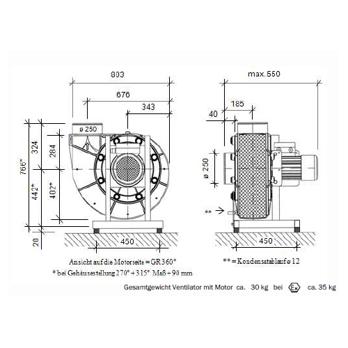 Direktgetriebener Radialventilator zur Förderung aggressiver und explosionsfähiger Gase, Temperatur max 40°C Ventilator II 3G c IIB T3 X 05 ATEX D085 Gehäuse aus PPs, in gespritzter Ausführung mit integrierten Dichtungssystem, bestehend aus Kondensatwehr als umlaufende Tropfkante und einer Labyrinthdichtung, mit zusätzlicher Fettsperre, von aussen nachfüllbar, und Lippendichtung, Kondensatablaufstutzen an der tiefsten Gehäusestellung Laufrad mit rückwärtsgekrümmten Schaufeln aus PPs, in gespritzter Ausführung mit Rückenbeschaufelung für garantierten Unterdruck an der Wellendurchführung im Betrieb, Gehäusestellung GR, Ausblasrichtung 45° / 90° / 135° / 180° / 270° / 315° /360° Grundrahmen: Stahl-verzinkt Antrieb : Normmotor ATEX- konform EEx e II 2G T3 3 x 230/400V, 50 Hz, IP55, Wärmeklasse F, Zubehör : Gummi -Schwingungsdämpfer saug- und druckseitige Schutzgitter sind bauseitige Leistung durch Kunden Volumenstrom m3/h 250 - 1700 Druckdifferenz PA 220 - 60 EEx e II T3 Polzahl 6 Sync. Drehzahl bei 50 Hz 1000 1/min Motorleistung kW 0,37 Nennstrom bei 400 V 1,30 A Baugröße 80 Bauart B5 / IP55 |