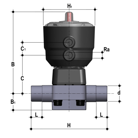 | 2/2-Wege-Membranventil mit pneumatischem Kolben-Stellantrieb mit optischer Stellungsanzeige maximierter Durchfluss Gehäusewerkstoff: PP Funktion: normal geschlossen (NC) Membranwerkstoff: EPDM Steuerdruck: max. 6 bar Steueranschluss (Ra): G 1/4' Antriebsfarbe: schwarz (mit grauer Haube) Steueranschluss in Durchflussrichtung Betriebsdruck: einseitig anstehend Anschluss: Schweißstutzen zum Heizelementmuffenschweißen |