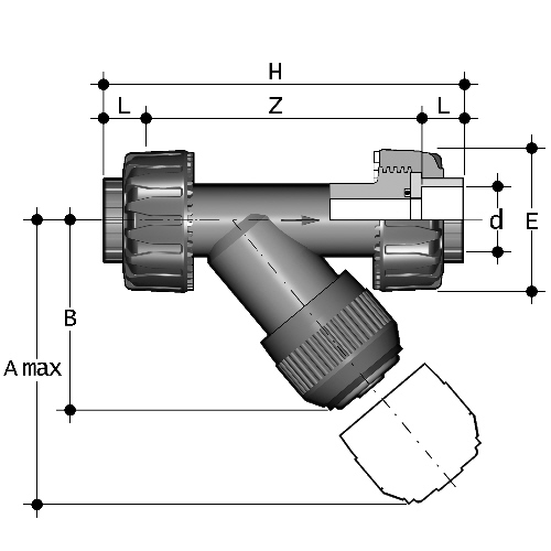 | -Dichtung: EPDM -Anschluss: Verschraubung mit Klebemuffe -eingebautes Filternetz mit Maschenabstand 1,5 mm, Verunreinigung ab 0,5 mm trennbar -Einbau: waagrecht und senkrecht in Leitung -Durchflussrichtung: Siebteil nach unten gerichtet -andere Maschenabstände auf Anfrage |