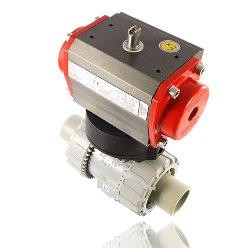 2/2-Wege-Kugelhahn mit gesicherten Überwurfmuttern aus PVC-C mit pneumatischem Stellantrieb